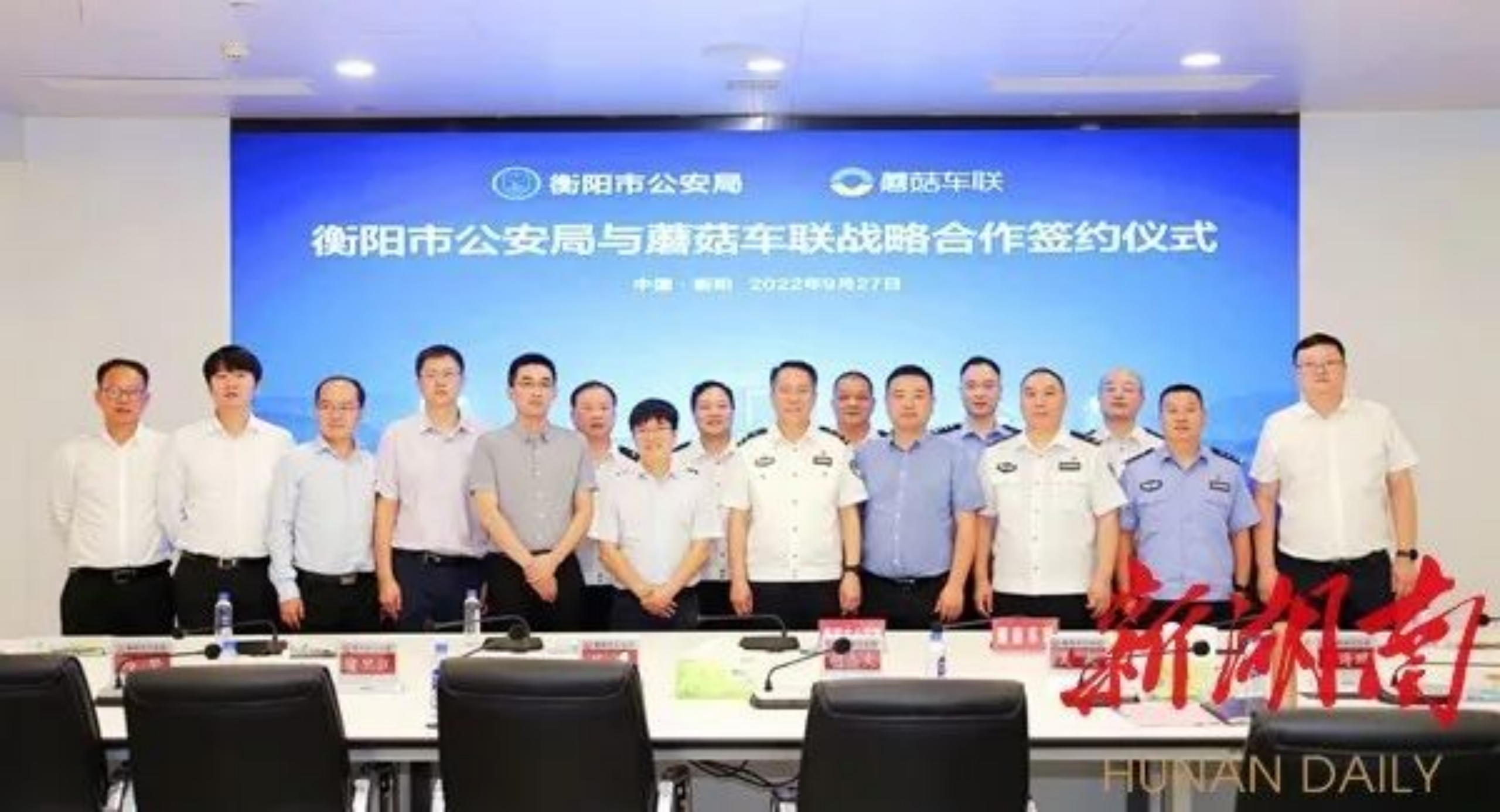 9月27日,衡阳市公安局与蘑菇车联签订战略合作协议。双方将在人工智能、警用巡逻机器人研发与应用等方面进行深度合作,将自动驾驶技术、智慧交通系统与警务防控相结合,实现室外全天候自动巡逻,提高见警率,提升人民群众安全感、获得感、幸福感。当天,双方共建的联合创新实验室在大数据中心揭牌。该实验室将推进警用巡逻机器人产品研发和实战应用,打造衡阳人工智能研学产高地和公安现代警务模式创新高地。